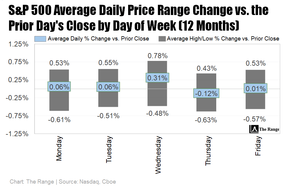 While Thursday’s sell-off did extend beyond 2 volatility on an intra-day basis, indicating abnormal near-term volatility, the fact that the S&P 500 was able to rally late on Thursday, preventing a > 2 volatility close, means that the average price ranges shown on this next graph can still be helpful for context over the coming week.