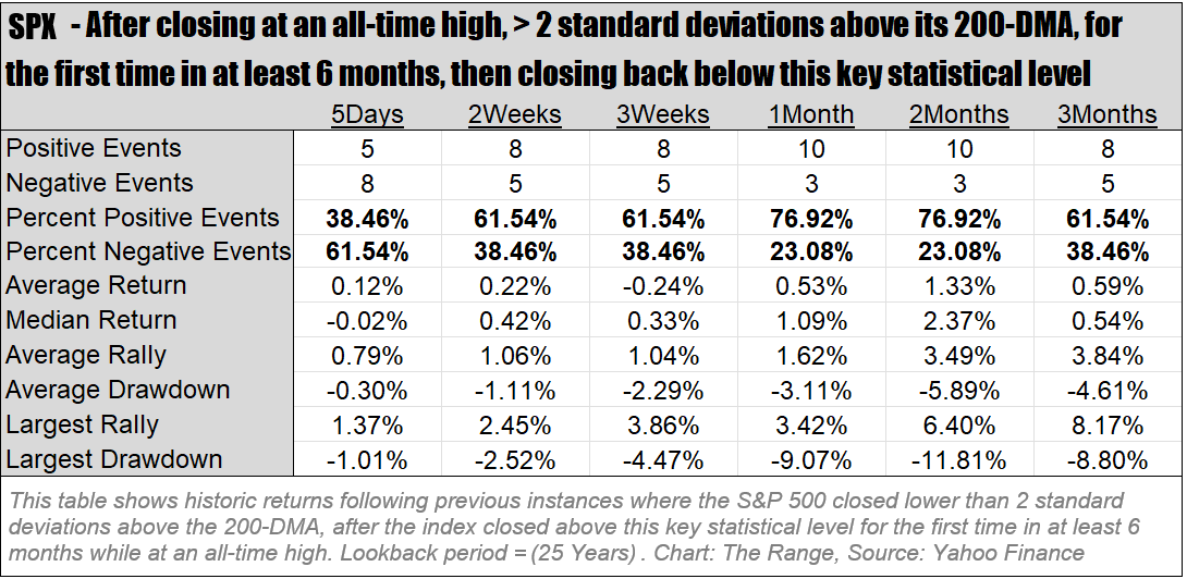 On the chart directly below, to match the conditions similar to what occurred last week, we used red circles to mark previous instance where the S&P 500 closed above the top 2 standard deviation band for the first time in at least 6 months, while trading at an all-time high, then closed back below this key statistical level.