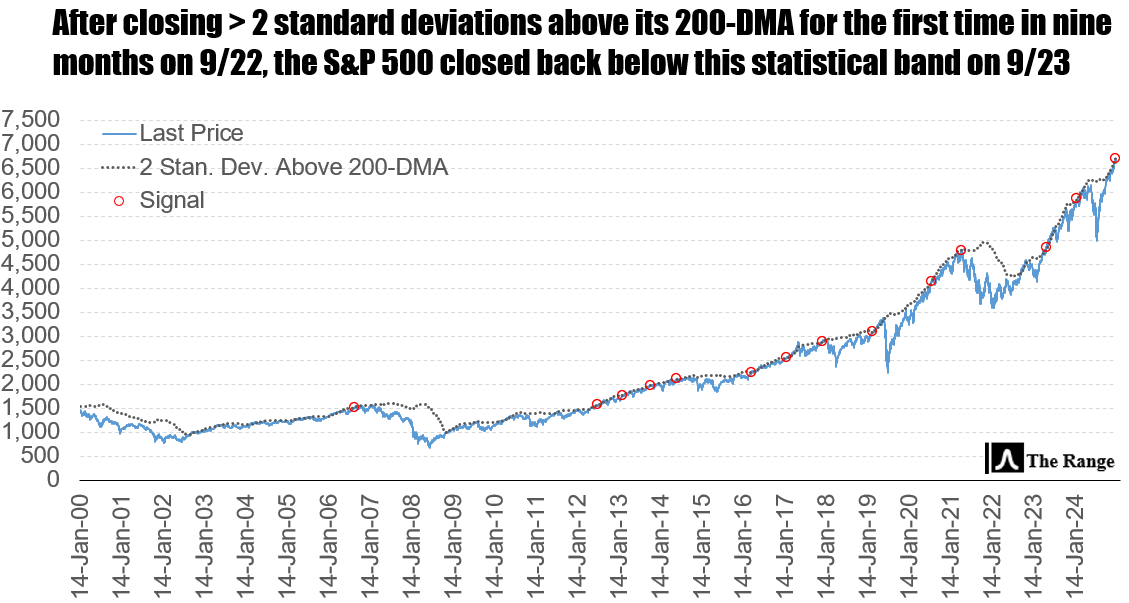 But it is also noteworthy that the S&P 500 quickly closed back below this important level the following day. It’s important because, statistically, this is a signal that the potential for additional mean reversion has increased.