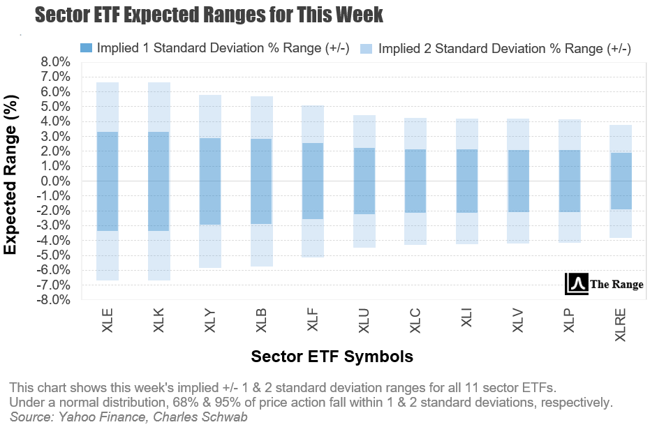 This week, the energy (XLE) sector is expected to be the most volatility sector, with technology (XLK) and consumer cyclicals sectors registering the next highest levels of implied volatility.