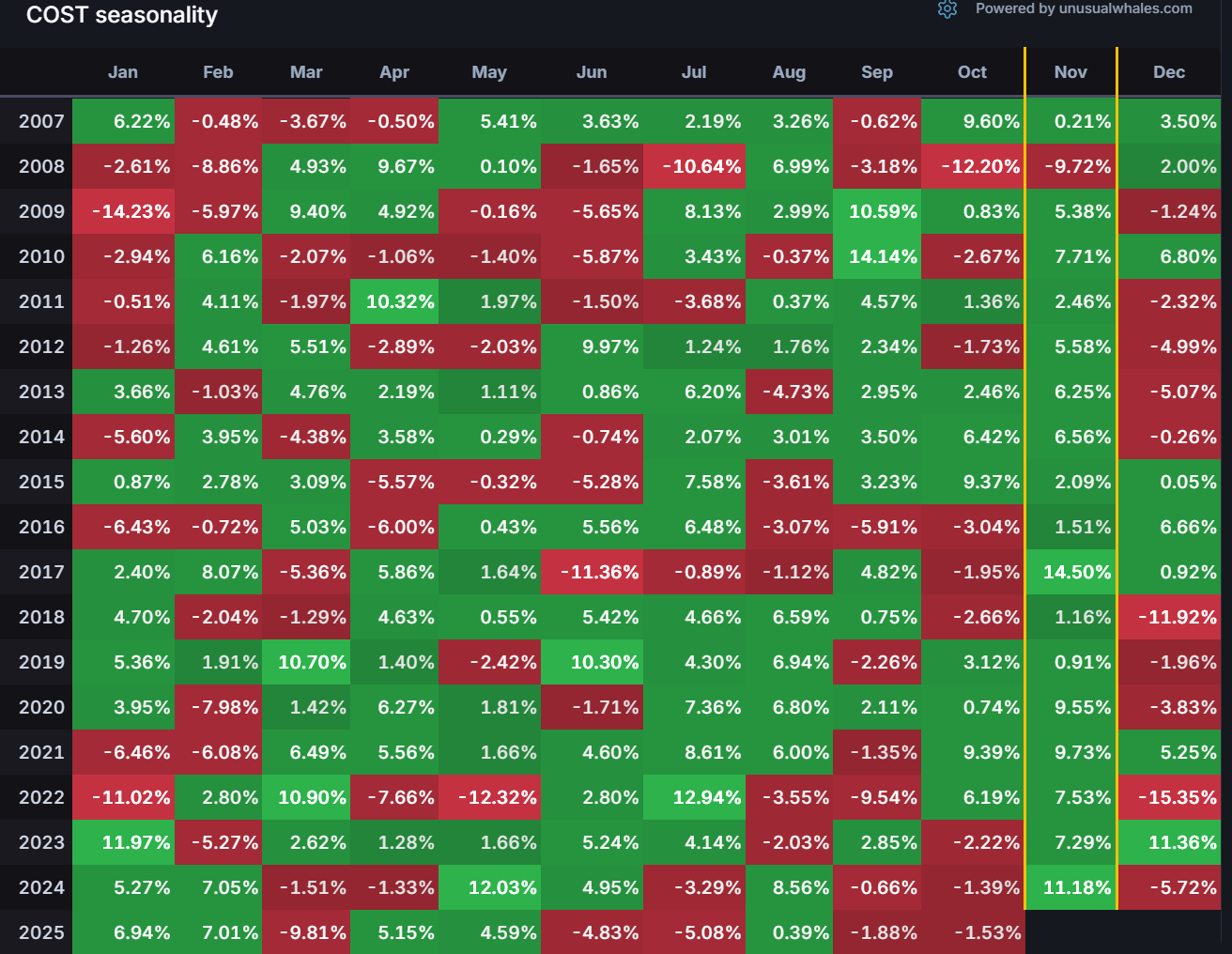 According to the Unusual Whales platform, of the 50 largest companies by market cap, Costco Wholesale is the only company to have finished November in the green every year since the Great Financial Crisis.