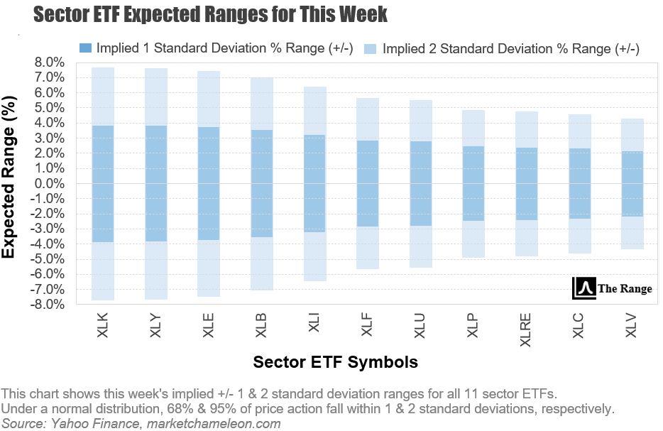 This week, volatility is expected to be the highest in the technology (XLK), cyclicals (XLY), and energy (XLE) sectors.