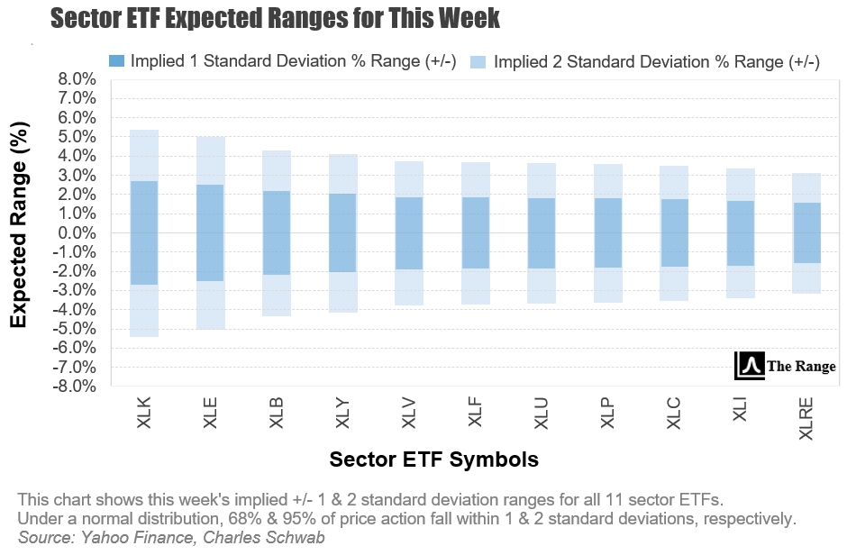 Conversely, the communications (XLC), industrials (XLI) and real estate (XLRE) sectors are where you will find the smallest expected ranges due to low implied volatility.