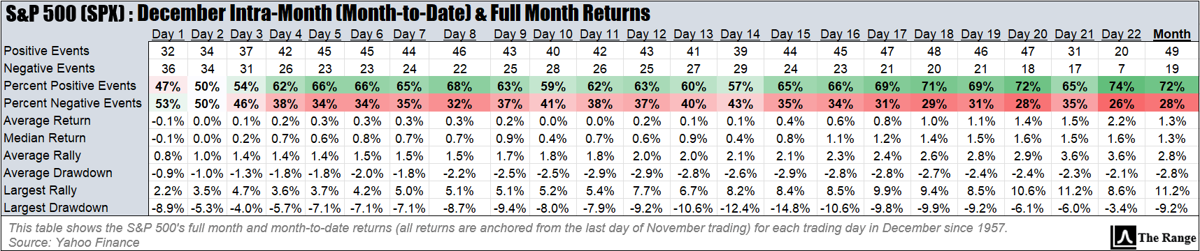 As the far-right column of the table shows, December has ended in the green a hefty 72% of the time since then, with an average gain of +1.3%.