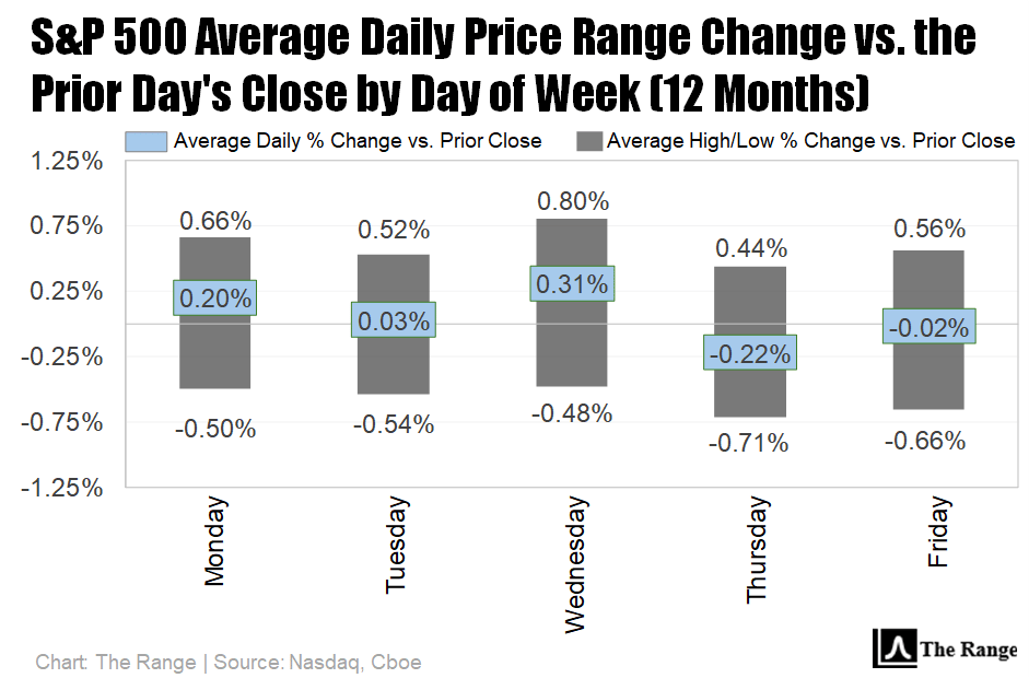 For both stock and options traders: Knowing what the implied weekly range is helps set expectations for what the likely trading limits will be. This can help prevent overreaction near quantified range extremes, while also informing the traders on whether there is still room for an intra-week rally or sell-off to run.